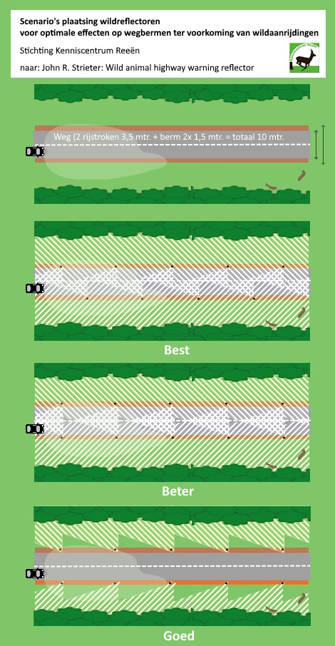 Helaas is er beperkt gericht onderzoek gedaan naar de relatie effect plaatsing op aantal wildaanrijdingen. Het geen leidt tot veel discussie over de werking. Geredeneerd vanuit de reflectie en het onrustig maken van weg en berm voor de dieren adviseren wij scenario B of D. Afhankelijk van de breedte van de weg en de afstand tussen de reflectoren.
