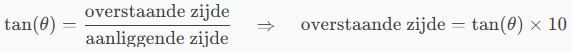 Waarbij tan() wijst op de wiskundige functie om de lengte de overstaande zijde en de aanliggende zijde in een rechthoekige driehoek te bereken.